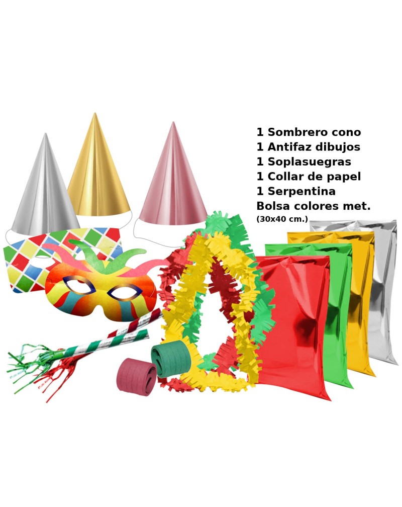 1 sombrero de cono esp., 1 antifaz mosaik/metalizado, 1 pito/soplasuegras, 1 collar de papel, 1 serpentina