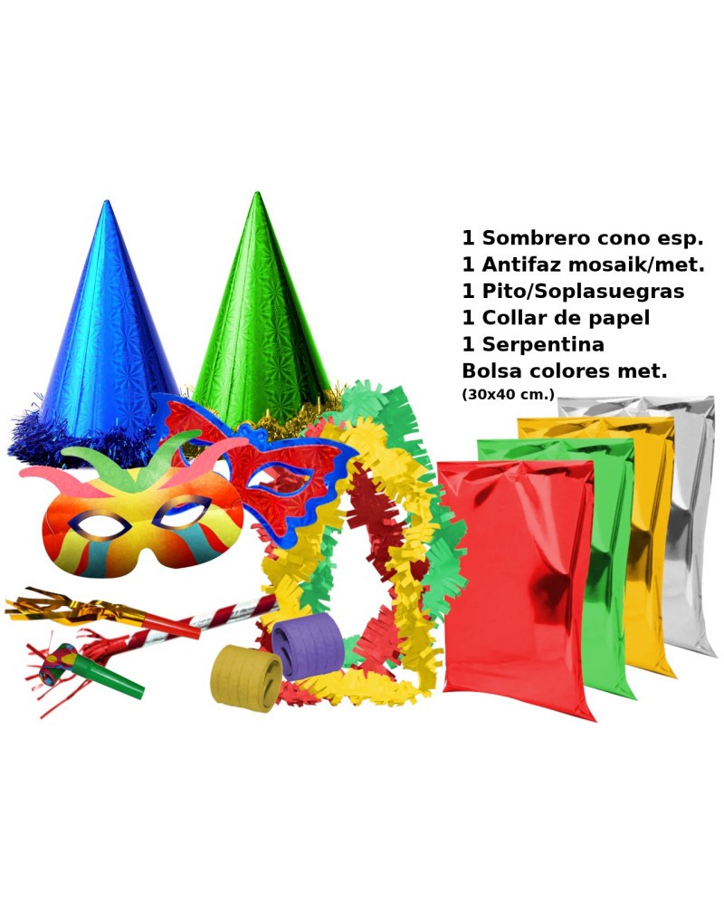 1 sombrero de cono esp., 1 antifaz mosaik/metalizado, 1 pito/soplasuegras, 1 collar de papel, 1 serpentina