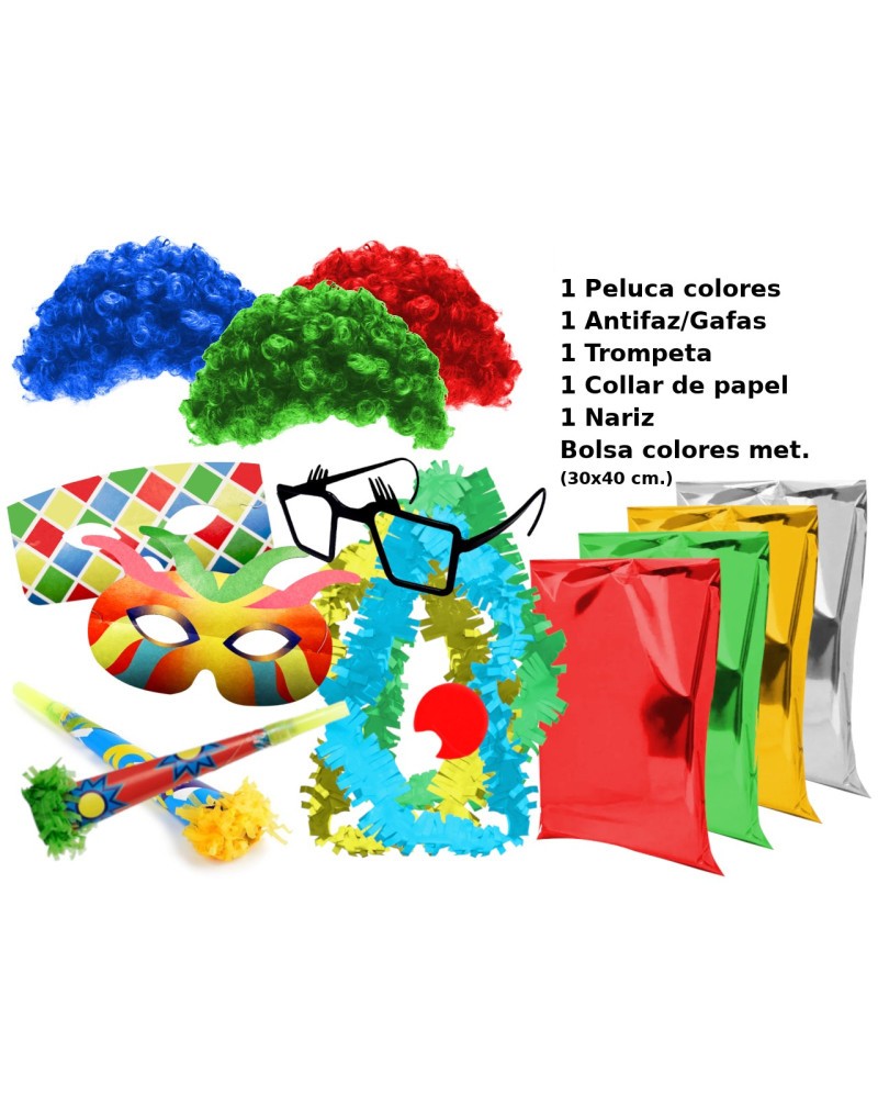 1 peluca colores, 1 antifaz/gafas, 1 trompeta, 1 collar de papel, 1 nariz