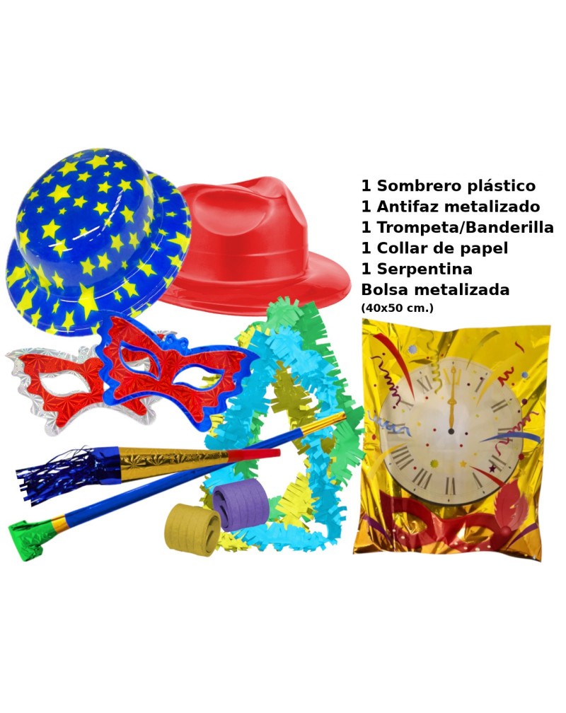 1 sombrero surtido plástico, 1 antifaz metalizado, 1 trompeta/banderilla, 1 collar de plástico, 1 serpentina, 1 corbata/maraca