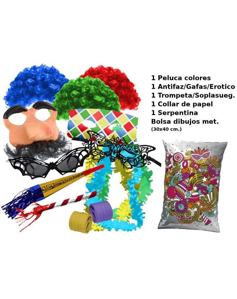 1 peluca de colores, 1 antifaz/gafas/erótico, 1 trompeta/soplasuegras, 1 collar de papel, 1 serpentina