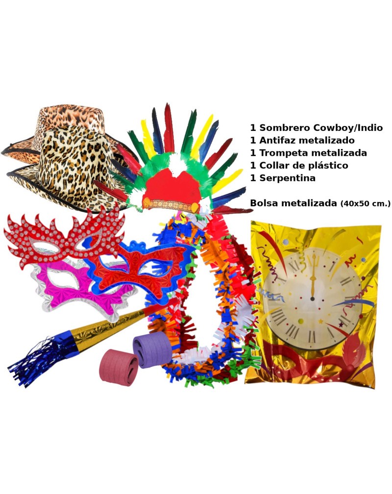 1 sombreo cowboy/indio, 1 antifaz metalizado, 1 trompeta metalizada, 1 collar de plástico, 1 serpentina